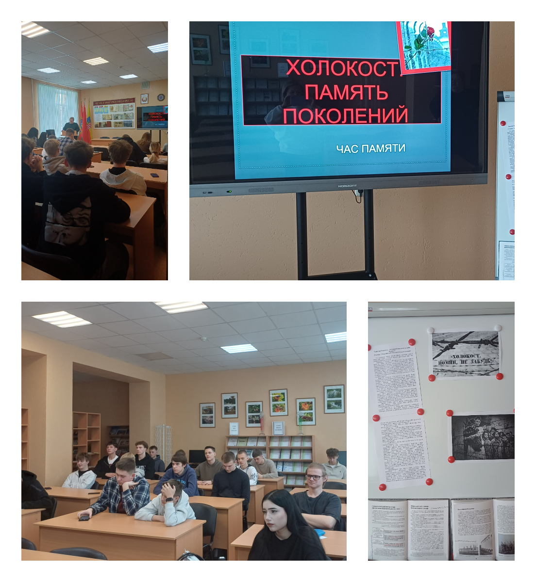 подготовили выставку-память «Холокост. Помни, не забудь!» и провели для учащихся колледжа час памяти, посвящённый Международному дню жертв Холокоста. Посмотрев видеофильм и презентацию, учащиеся узнали о страшных событиях, которые происходили во время Великой Отечественной войны.